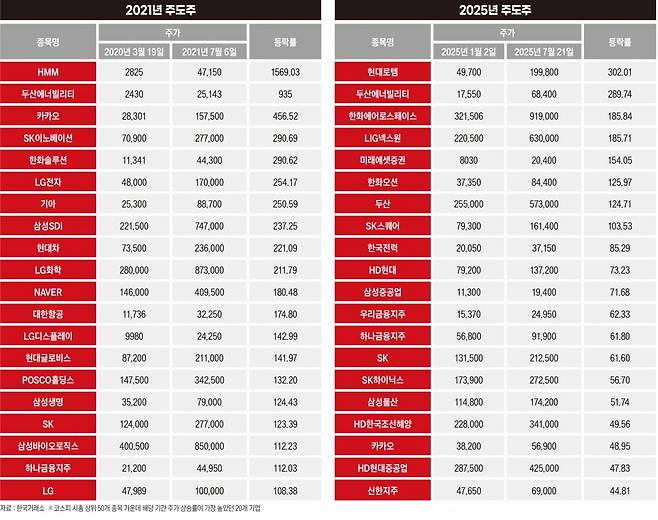 2021년 주도주 상위 10개 종목 중 절반 이상이 2025년 주도주 랠리에서 배제된 것도 주목할 만하다. HMM과 두산에너빌리티, 카카오 정도만이 주도주 반열에 재등장했을 뿐 나머지는 주가 부진과 산업 모멘텀 소멸로 저조한 수익률을 올리거나 마이너스 수익률을 기록해야 했다.