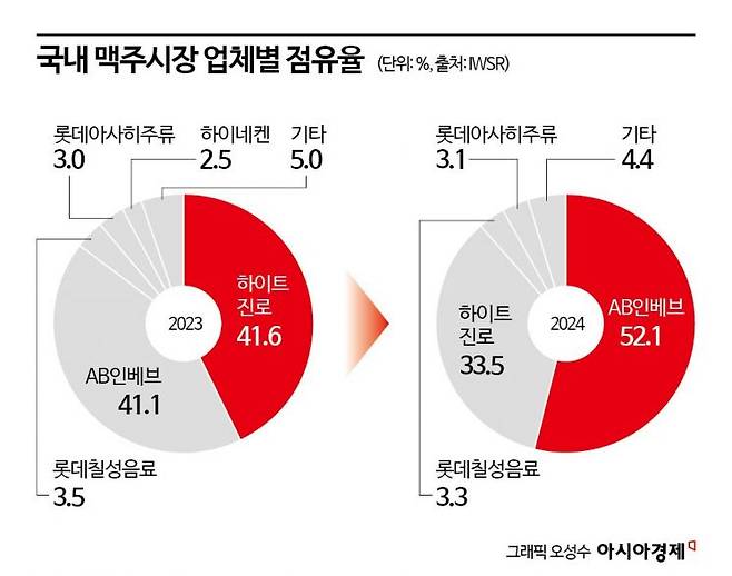 29일 글로벌 주류시장 분석업체 IWSR에 따르면 AB인베브가 지난해 국내 맥주 시장에서 업체별 점유율 52.1%를 기록한 것으로 나타났다. 이는 1년 전(41.1%)보다 11.0%포인트 증가한 것으로, 점유율 50%를 넘긴 AB인베브는 하이트진로를 밀어내고 업계 1위 공급사로 올라섰다.