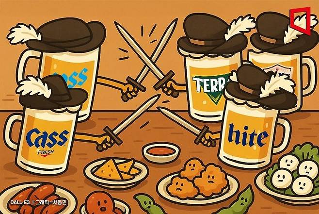반면 같은 기간 하이트진로는 시장점유율이 41.6%에서 33.5%로 축소되며 2위로 밀려났다. 2023년 출시한 신규 브랜드 '켈리'가 첫해 717만케이스에서 지난해 929만케이스로 판매량을 30%가량 끌어올렸지만 2·3위 브랜드인 '테라(4006만케이스→3667만케이스)'와 '하이트(2967만케이스→2672만케이스)'가 모두 판매량이 줄어들며 점유율 하락을 피하지 못했다. 이밖에 롯데칠성음료와 롯데아사히주류는 3%대 시장점유율을 유지했다.