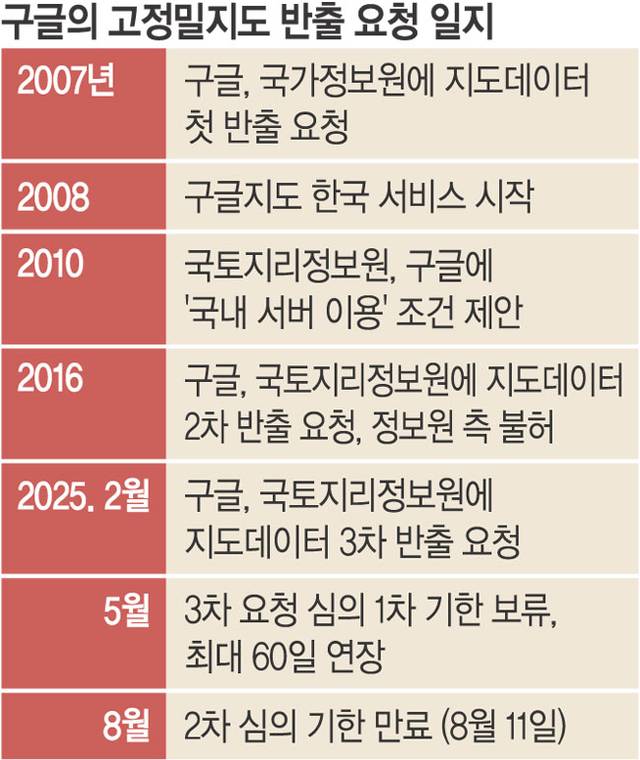 앞서 구글은 2007년과 2016년 두 차례에 걸쳐 국내 고정밀지도 데이터를 해외에 있는 구글 데이터센터로 이전할 수 있도록 한국 정부에 요청해왔다. 2016년 신청 당시 정부는 한국에 데이터센터를 설치하고, 안보시설을 비공개 처리할 것을 조건으로 내세웠지만 구글은 데이터센터 설치를 거부했다. 안보시설은 희미하게 처리하는 ‘블러’(가림)를 하겠다고 제안했으나, 이를 위해 기밀시설 위치 좌표를 줄 것을 요구해 논란이 일었다. 결국 정부는 국가 안보를 이유로 구글의 이전 요청을 거부했다. 지난 2월 구글은 세 번째로 고정밀지도 반출을 신청했다. 다만 이번에는 안보시설 블러 처리 조건을 따르고, 정보 보안 관련 책임자를 지정하고 관련 핫라인을 구축하겠다고 하는 등 적극적인 모습을 보이고 있다. 애플 또한 지난 6월 2023년에 이어 두 번째로 반출을 신청했다.
