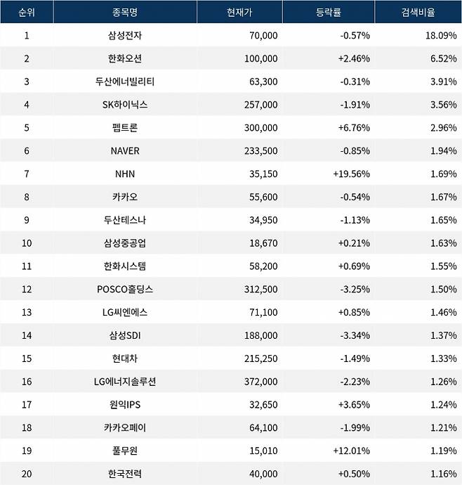 이어 한화오션(042660)이 검색비율 2위를 기록하며 2.46%의 상승세를 기록하고 있다. 검색비율 3위의 두산에너빌리티(034020)는 0.31% 하락하며 출발하고 있다. 검색비율 4위 SK하이닉스(000660)는 개장 초반부터 1.91%의 하락률로 주가가 하락 중이다. 검색비율 5위 펩트론(087010)은 6.76% 상승하며 강한 상승세를 보이고 있다.