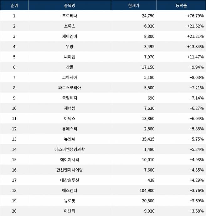 [서울데이터랩]프로티나 76.79% 폭등…실시간 상승률 1위