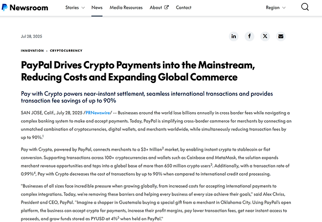페이팔은 이 서비스를 활용하면 3조달러 이상의 가상자산시장에 상인들이 연결될 수 있는게 장점이라고 강조했다.