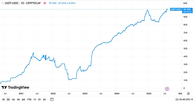 USDT와 USDC의 시가총액 차이는 현재 993억달러다.