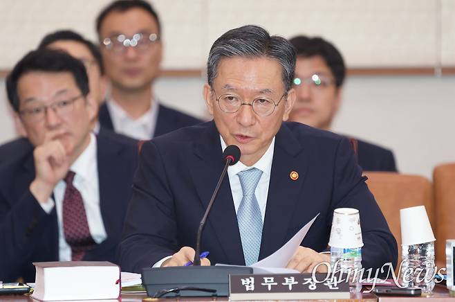 | ▲ 정성호 법무부 장관이 22일 서울 여의도 국회에서 열린 법제사법위원회 전체회의에 출석해 의원 질의에 답변하고 있다. |