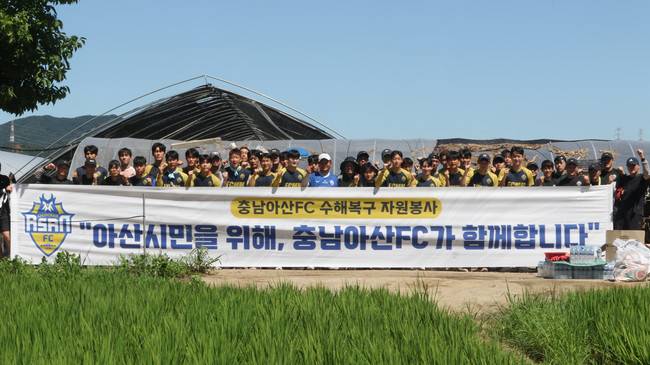 충남아산프로축구단(구단주 오세현, 대표이사 이준일, 이하 충남아산FC)은 오늘 27일, 선수단을 비롯한 50여 명의 구단 관계자들이 함께 아산시 염치읍 피해 농가를 찾아 수해 복구 자원봉사 활동에 나섰다.