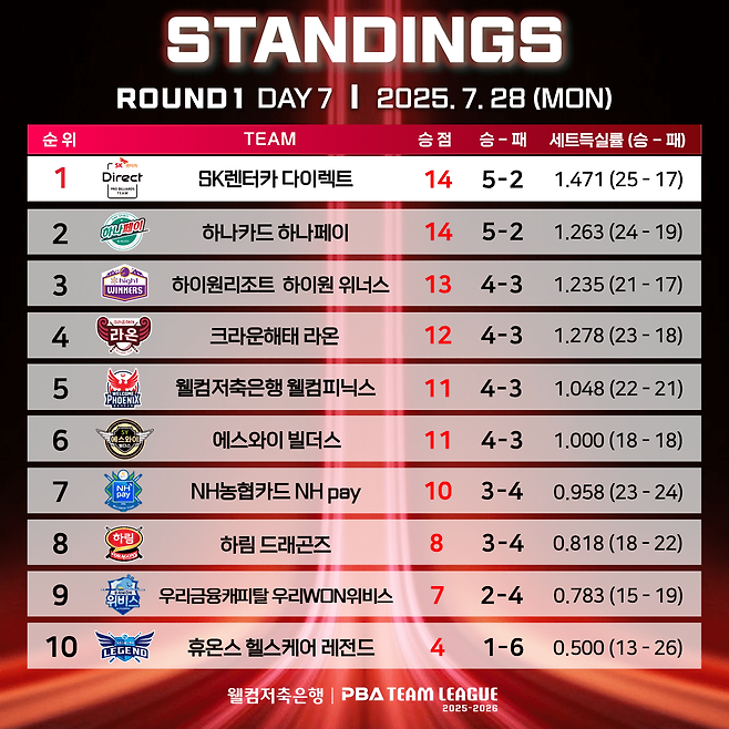 하나카드는 28일 경기도 고양시 '고양 킨텍스 PBA 스타디움'에서 열린 '웰컴저축은행 PBA 팀리그 2025-2026' 1라운드 7일차서 풀세트 접전 끝에 크라운해태를 꺾고 5연승을 질주했다. SK렌터카는 하이원리조트에 2:4로 패배해 4연승을 마감했다.
