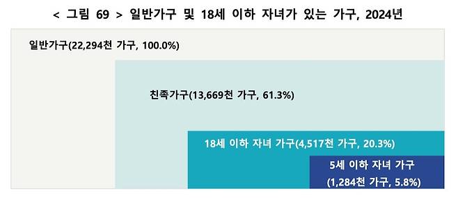 5세 이하 자녀가 있는 가구는 128만4천가구(5.8%)로, 역시 전년보다 5.3% 감소했다.