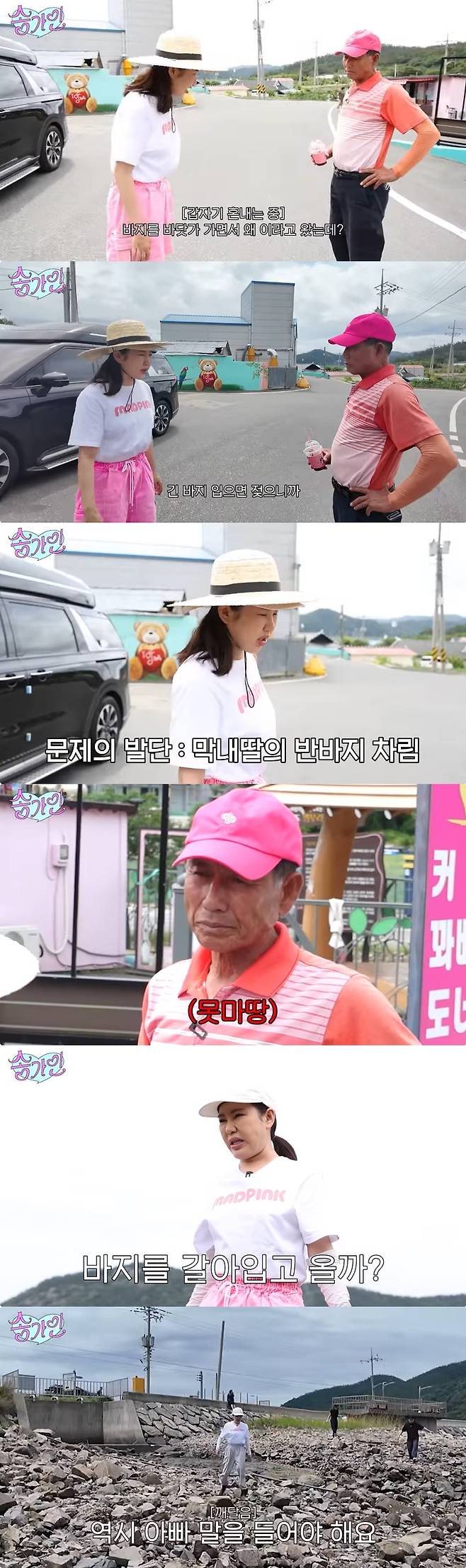 송가인이 분홍 반바지에 흰 티셔츠, 모자를 착용하고 등장하자 송가인의 아버지는 "바지를 바닷가 가면서 왜 이러고 왔냐"며 짧은 반바지 옷차림을 지적했다.