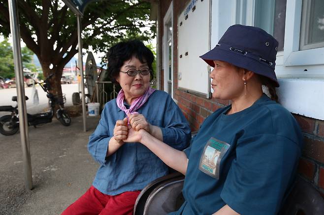 동산리 경로당 앞 벤치에 앉아있는 딘티마이씨를 마주치자, 지나던 주민들이 한마디씩 인사를 건넨다. 반갑게 다가와 옆에 앉더니 덥석 손을 잡는 이도 있다. 오전에 김치와 관련된 소동이 한바탕 있었던 모양인지, 자초지종 설명하더니 그는 "이따 김치를 좀 가져가라"고 당부한다. 딘티마이씨 이전에 13년간 동산리 부녀회장을 맡았던 권상순(71)씨다.