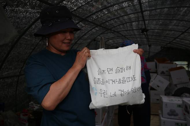 | ▲ 딘티마이씨는 딸이 글씨를 써 넣어 선물한 천가방을 소중히 몸에 지니고 다닌다. |