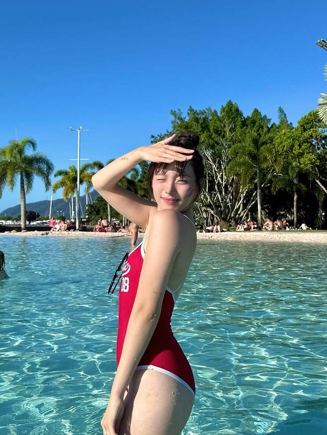 사진 속 하지원은 맑고 푸른 하늘 아래 야자수와 수영장이 어우러진 호주의 한 수영장을 배경으로 선명한 붉은색 원피스 수영복을 입고 물놀이를 즐기고 있다.