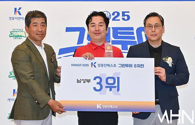 이날 경기에서 1 언더파로 3위를 한 김준배가 한국미드아마추어골프연맹 문종열 부회장, 경동인베스트 정승진 대표와 포토타임을 갖고 있다.