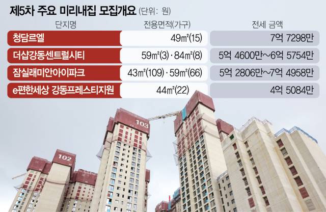 그러나 6·27 규제로 대출 문턱이 높아지면서 미리내집 수요자들의 타격이 불가피할 것으로 보인다. 서울시가 다음 달 11~12일 신청을 받는 ‘제5차 미리내집(485가구)’ 모집개요를 보면 전세금은 3억 3228만 원(동작구 힐스테이트 장승배기역·44㎡)부터 7억 7298만 원(강남구 청담르엘·49㎡)까지로 책정됐다. 신혼부부전용 전세자금 대출한도가 3억 원에서 2억 5000만 원으로 줄어든 만큼 신청자들은 현금을 더 마련해야 하는 상황이다.