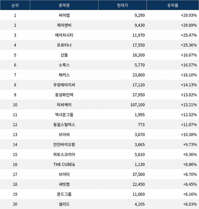 이어 상승률 2위 제이엔비(452160)는 주가가 29.89% 폭등하며 종가 9,430원에 상승 마감했다. 상승률 3위 에이치시티(072990)의 주가는 11,970원으로 25.47% 폭등하며 강세를 보였다. 상승률 4위 프로티나(468530)는 25.36% 폭등하며 17,550원에 마감했다. 상승률 5위 산돌(419120)은 16.67%의 급등세를 타고 종가 18,200원에 마감했다.