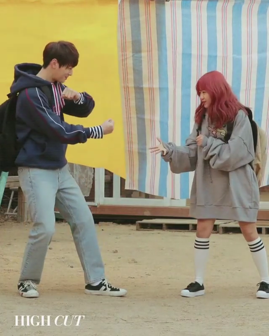 30cm 이상의 키 차이를 두고 장난스럽게 가위바위보 게임을 즐기는 장면은 '은유적 케미'라는 수식어를 낳으며 두 사람의 다정한 호흡을 엿볼 수 있게 했다. 당시 공개된 커플 화보 속 '남친있음', '여친있음', '접근금지'라는 위트 있는 문구의 뱃지가 달린 가방은 팬들 사이에서 큰 화제가 되기도 했다.