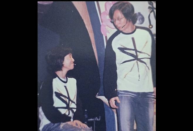 다른 사진은 무대 위에서 커플 티셔츠를 입고 마이크를 쓴 채 서로를 바라보는 두 사람의 모습이다. 서로를 바라보는 시선에서 호흡이 잘 맞는 동료이자 오래된 친구임을 엿볼 수 있다.