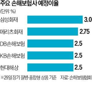 29일 보험업계에 따르면 삼성화재는 다음달 1일 장기 보장성보험 등에 대한 예정이율을 기존보다 0.25%포인트 인하한다. 앞서 DB손해보험도 다음달 1일부터 장기 보장성보험 예정이율을 0.25%포인트 내리기로 했다. 1, 2위 손해보험사가 동시에 예정이율을 인하하는 것이다.