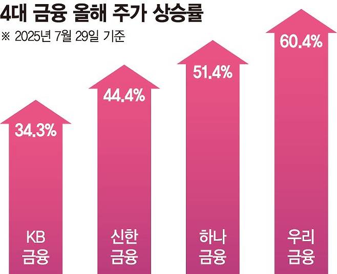 29일 금융권에 따르면 올해 4대 금융의 주가는 KB금융(34.3%), 신한금융(44.4%), 하나금융(51.4%), 우리금융(60.4%) 등 큰 폭으로 올랐다. 이재명 정부의 자본시장 활성화 정책과 금융지주의 밸류업 프로젝트가 맞물리며 투자자들의 기대감이 몰리는 모습이다.