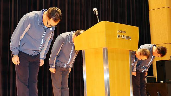 ▲ 정희민 포스코이앤씨 사장이 29일 인천 송도 본사에서 연이은 현장 사망사고와 관련한 담화문 발표에 앞서 관계자들과 사과 인사하고 있다.