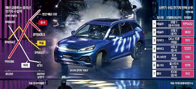 지난 28일 테슬라 서울 강남스토어에서 만난 판매원은 “모델Y는 지금 주문해도 오는 11월에나 받을 수 있다”며 이처럼 말했다. 한국 시장을 휩쓸고 있는 중국산 전기차는 모델Y뿐만이 아니다. 올 상반기 수입 전기차 톱10 중 6개가 중국산이었다. 전체 전기차 수입량에서 중국산 비중은 65.4%로 독일(29.3%)과 미국(3.6%)을 압도했다. 현대차·기아를 포함한 전체 전기차 판매량으로 범위를 넓혀도 중국산 점유율이 24.2%에 달했다. 글로벌 메이커가 중국에서 제작한 차량뿐 아니라 비야디(BYD), 지커 등 중국 토종 브랜드도 속속 한국에 뛰어들고 있는 만큼 중국산 전기차의 공습은 한층 거세질 것으로 전망된다.