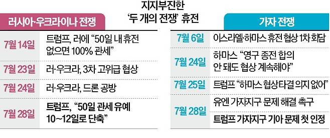 도널드 트럼프 미국 대통령이 ‘두 개의 전쟁’ 종식을 위해 러시아와 이스라엘을 압박하고 나섰다. 우크라이나와 3년 넘게 전쟁을 벌이고 있는 러시아에는 100% 관세 부과 시한을 당초 제시한 50일보다 앞당기겠다고 경고했다. 이스라엘에 대해선 가자지구의 기아 문제를 처음으로 인정하며 베냐민 네타냐후 총리와 거리를 뒀다.