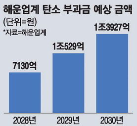 국제해사기구(IMO) 해양환경보호위원회가 도입한 온실가스 배출 규제로 인해 국내 해운 업계가 2028년 5억2000만달러(약 7130억원)의 탄소부과금을 맞게 됐다. 이 부과금은 2029년에는 7억6400만달러(약 1조529억원), 2030년에는 10억1200만달러(약 1조3927억원)로 급증할 것으로 전망된다.