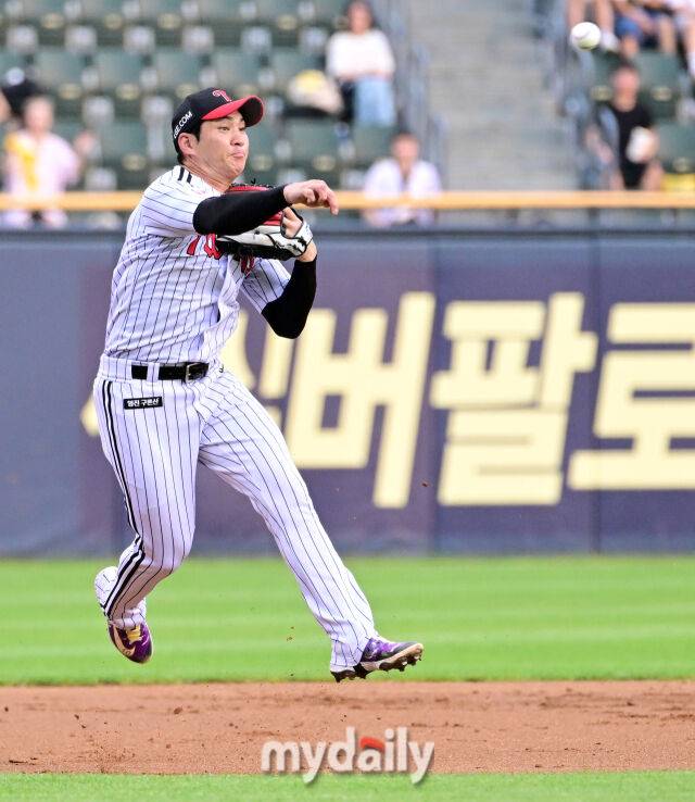 LG 유격수 오지환이 2회초 1사 2루서 KT 안치영의 타구 때 3루수 구본혁이 포구 실책을 하자 흐르는 공을 잡고 1루로 송구하고 있다.