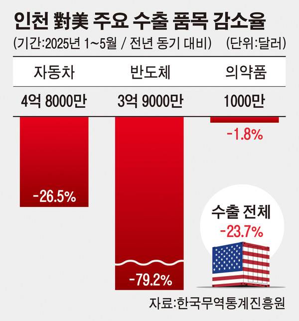 대미(對美) 수출품목 집중도가 높은 인천 경제가 트럼프 관세정책의 직격탄을 맞은 것으로 조사됐다. 1~5월 사이에 미국 반도체 수출은 79.2% 급락했고, 자동차는 26.5%나 줄었다.