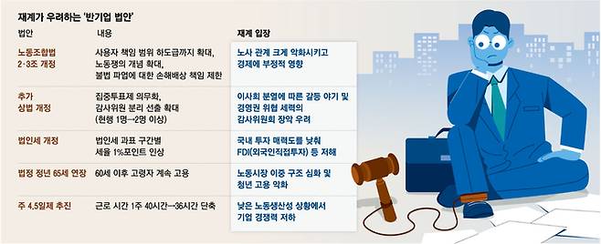 재계 관계자는 “기업을 옥죄는 법안이나 규제들이 동시에 쏟아질 경우 투자심리가 급격히 위축되고 경영 불확실성이 커져 생존 자체가 위협받을 수 있다”고 호소했다.