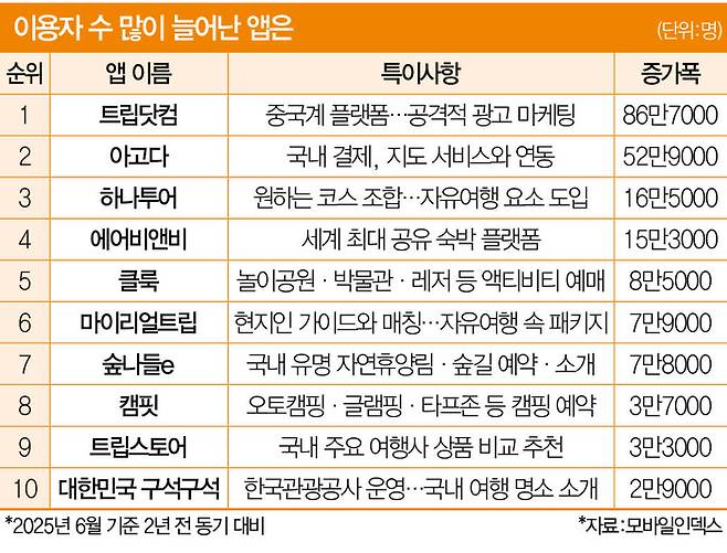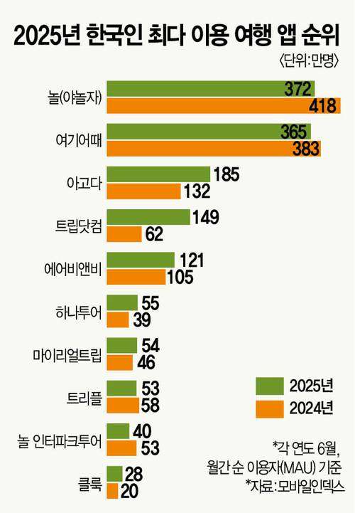 한국인이 자주 쓰는 여행 애플리케이션(앱)은 무엇일까. 매경이코노미는 빅데이터 전문 플랫폼 ‘모바일인덱스’에 문의해 2025년 6월 기준 월간 순 이용자 수(MAU)가 가장 많은 여행 앱을 살펴봤다. 과거와 달라진 트렌드 비교를 위해 엔데믹이 본격화된 2년 전인 2023년 같은 기간 데이터와 비교했다.