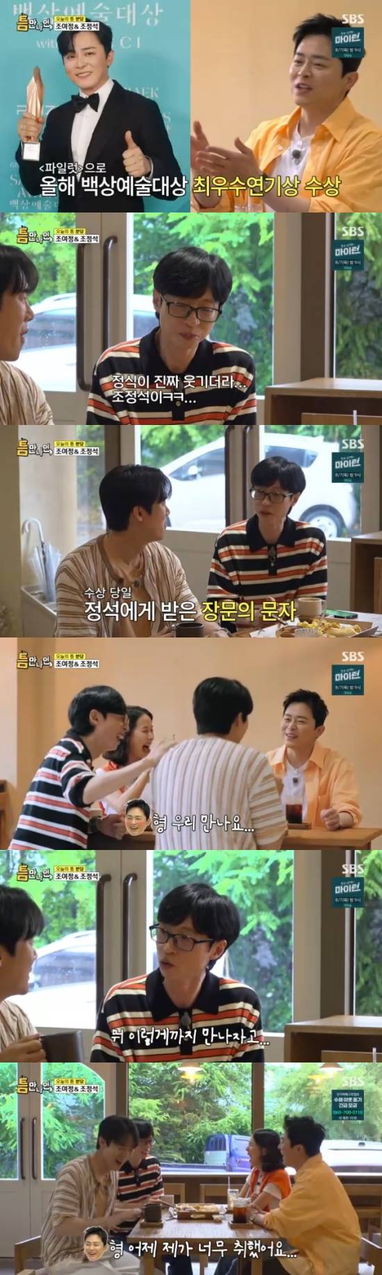 또 이날 유재석은 조정석에게 "영화 '파일럿'으로 백상예술대상 최우수 연기상을 받지 않았냐"고 했고, 조정석은 "맞다. 그날 재석이 형이 저한테 축하 문자도 보내주셨었다"면서 웃었다.