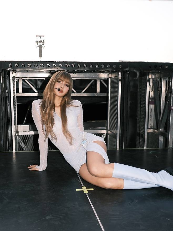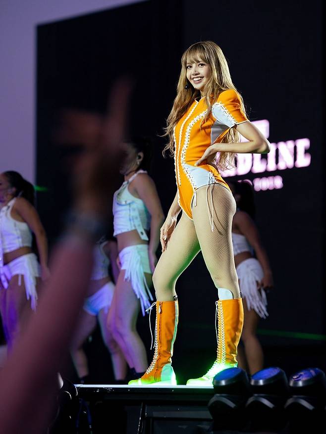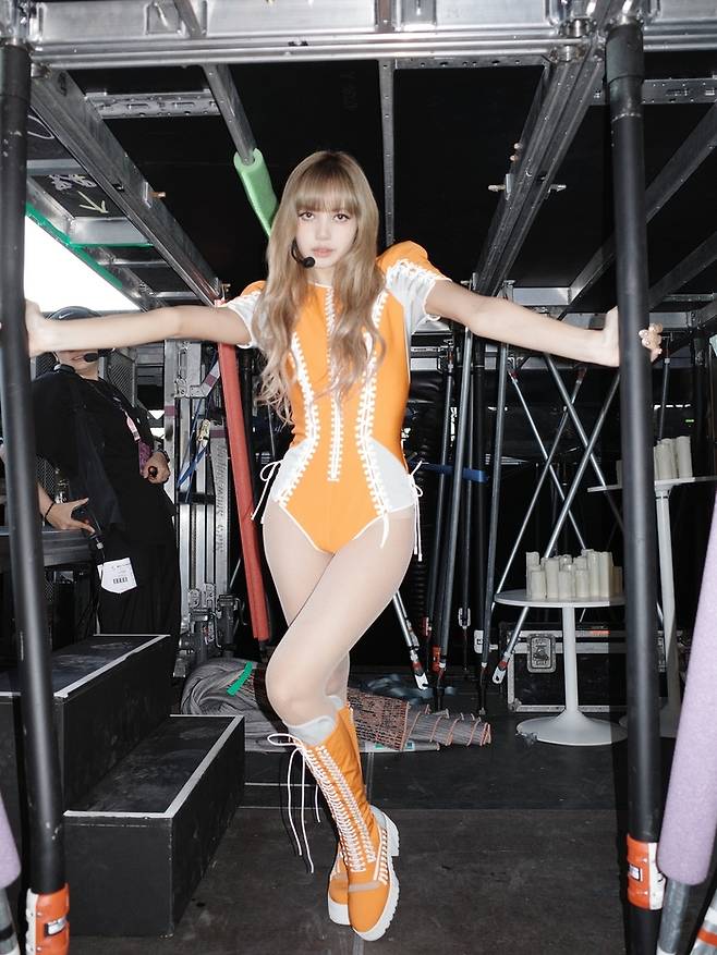 공개된 사진 속 리사는 강렬한 오렌지 컬러의 바디수트와 부츠, 그리고 세련된 실루엣의 파스텔 블루 원피스 의상 등 다양한 스타일을 소화하며 무대 위에서 독보적인 존재감을 드러냈다.