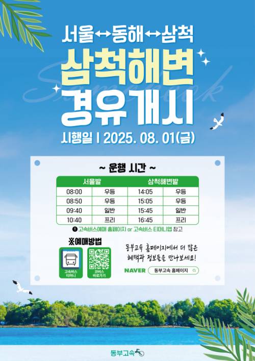 서울(강남)~삼척 노선 운행사인 동부고속은 다음 달 1일부터 하루 4차례 삼척해수욕장 앞 중간 정차를 시행할 예정이다. 이에 따라 서울에서 삼척을 향하는 오전 8시, 8시50분, 9시40분, 10시40분 버스는 삼척해수욕장에 중간 정차를 하게 된다.