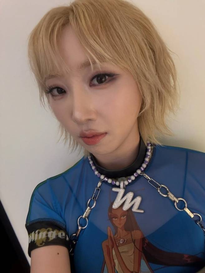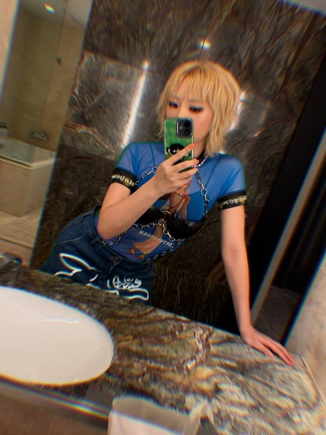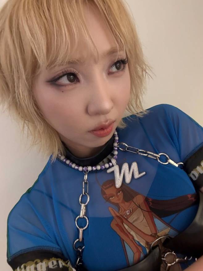 사진 속 공민지는 살짝 입을 내밀며 카메라를 응시한다. 블론드 숏컷은 귀엽고도 자유분방한 이미지를, 오렌지 톤의 네일과 레이어드된 초커 목걸이는 펑키한 무드를 더한다.