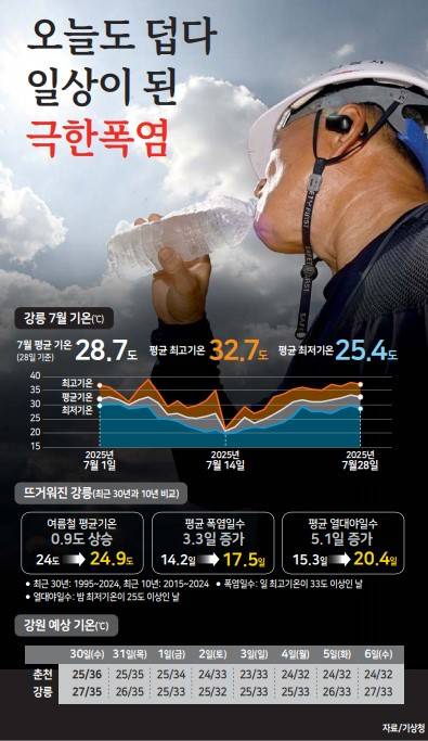 30일 아침 최저기온은 춘천 25도, 원주 25도, 강릉 27도이며, 낮 최고기온은 춘천 35도, 원주 35도, 강릉 33도다.