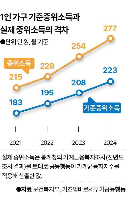 기준중위소득을 산정할 때 활용하는 통계자료(통계청 가계금융복지조사)를 바탕으로 시민단체인 '기초생활보장법 바로세우기 공동행동'이 중위소득을 산출한 결과, 2024년 1인 가구의 실제 중위소득은 약 277만 원이었다. 같은 해 1인 가구 기준중위소득(약 223만 원)은 실제보다 54만 원 적었던 셈이다. 3년 전인 2021년 1인 가구의 실제 중위소득(약 215만 원)과 기준중위소득(약 183만 원) 간 격차는 32만 원이었는데, 더 벌어진 것이다.