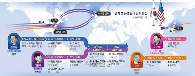 초읽기에 몰린 상황에서 정부는 ‘밀착 마크 외교’로 진정성을 보여 신뢰를 쌓고 합의 가능성도 높인다는 전략이다. 앞서 김정관 산업통상자원부 장관과 여 본부장은 지난 24일 워싱턴DC에서 하워드 러트닉 상무장관과 만난 뒤 다음날 러트닉 장관의 자택이 있는 뉴욕에서 2차 협상을 했다. 김 장관은 이 자리에서 ‘미국 조선업을 다시 위대하게’라는 뜻의 ‘마스가 프로젝트’를 제안했다. 26일에는 도널드 트럼프 대통령의 스코틀랜드 순방에 동행한 러트닉 장관과 제이미슨 그리어 미국 무역대표부(USTR) 대표를 쫓아 대서양을 건너 3차 협상을 했다. 전날 출국한 김동관 한화그룹 부회장도 한국 정부가 미국에 제안한 마스가 프로젝트 구체화를 위해 한국 정부 협상단에 합류한다.