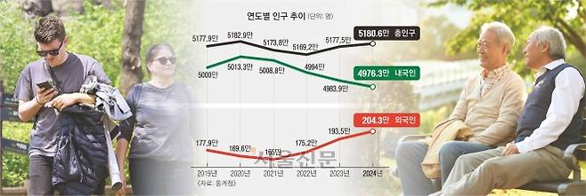 외국인 인구가 처음 200만명을 넘어섰다. 내국인 감소세가 4년 연속 이어졌음에도 ‘총인구 마이너스’를 가까스로 면했다. 저출산·고령화와 맞물려 65세 이상 고령인구는 1000만명을 돌파했다.