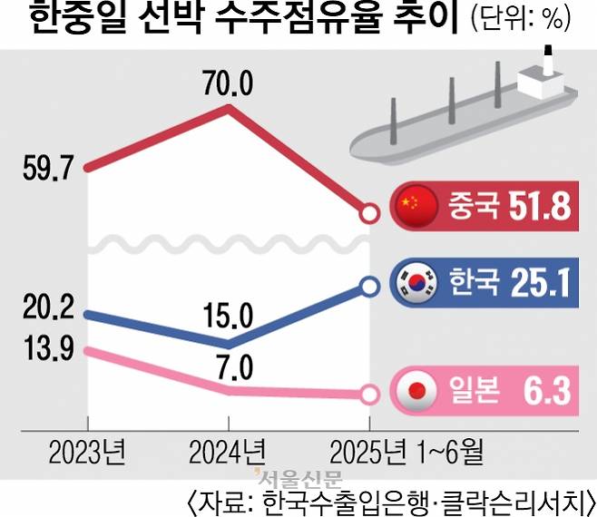 29일 한국수출입은행 해외경제연구소의 ‘해운·조선업 2025년 상반기 동향 및 하반기 전망’ 보고서를 보면, 올해 상반기 한국의 신조선 수주점유율은 25.1%(표준선 환산톤수)를 기록했다. 지난해(15.0%) 대비 6개월 만에 10% 포인트 넘게 오른 수치다. 중국의 점유율은 같은 기간 70.0%에서 51.8%로 급감했다.