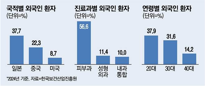 이들이 한국을 찾은 것은 대부분 피부과와 성형외과 등 미용성형 목적의 치료를 받기 위해서다. 외국인 환자들이 가장 많이 찾는 진료과목은 피부과(56.6%)로 압도적인 1등이었다. 2위 역시 성형외과(11.4%)로 K-뷰티를 선망하는 2030 여성들이 한국을 많이 찾은 것으로 확인됐다.