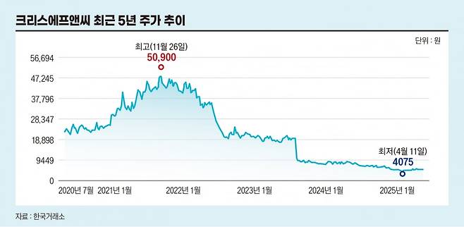 크리스에프앤씨 주가는 지난 7월 23일 4905원을 기록했다. 올해 2월 5000원 선이 무너진 이후 한때 4000원대 초반까지 내려갔으나 최근 소폭 회복했다.