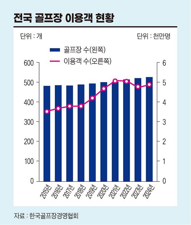 한국 골프산업 규모는 약 31조원(2024년 기준)으로 미국과 일본 다음으로 큰 시장이지만 골프장 이용객은 해마다 줄어들고 있다. 한국골프장경영협회에 따르면 2021년 처음으로 5000만 명을 돌파, 5057만 명의 이용객을 기록했지만 2023년 이 수치가 4772만 명으로 떨어졌고 지난해에는 4741만 명에 그쳤다.