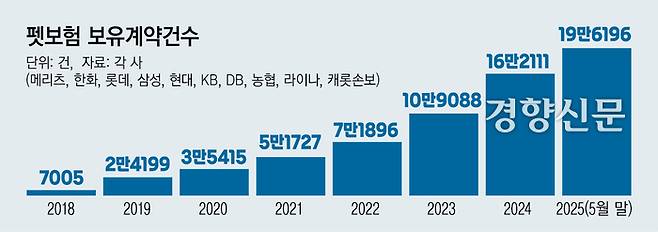 반려동물과 함께 사는 가구가 증가하면서 병원비 부담을 완화해주는 펫보험 시장이 점진적으로 규모를 키워가고 있다. 펫보험을 취급하는 손해보험사 10곳의 올해 5월 말 기준 펫보험 보유계약 건수는 19만6196건으로 지난해 말(16만2111건)보다 21% 증가했다. 2018년 7005건과 비교하면 7년새 25배 넘게 급증한 것이다.