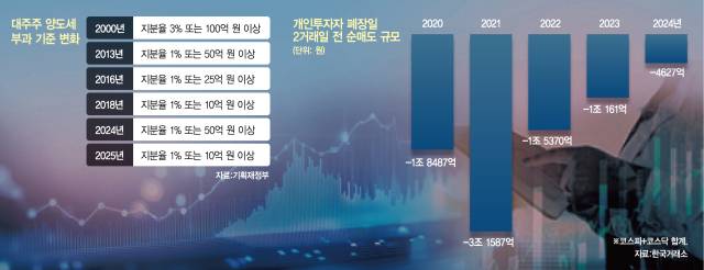 통상 한국 증시는 대주주 양도세 기준일인 12월 말(사업연도 종료일) 2거래일 직전까지 개인들이 물량을 대거 정리한다. 양도세 기준에 따라 과세 구간에서 벗어나기 위한 매매다. 실제 대주주 기준이 50억 원이던 지난해 개인들의 매도 규모는 4626억 원(코스피·코스닥 합산)에 그쳤지만 기준이 10억 원일 때(2018~2023년)는 매도세가 극심했다. 2023년 순매도 규모는 1조 161억 원, 2022년 1조 5370억 원, 2021년 3조 1587억 원에 이른다. 특히 이재명 대통령 당선 이후 증시가 크게 오른 만큼 연말 매도세는 더욱 강해질 수 있다.