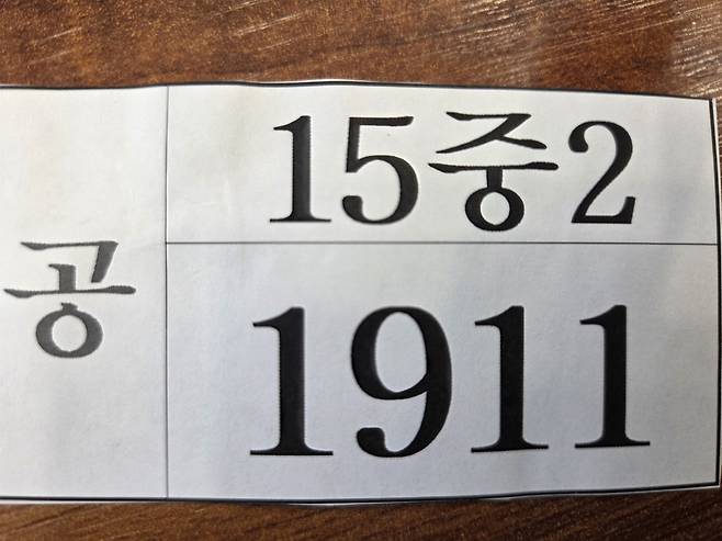 | ▲ 신학림 전 전국언론노조위원장이 서울구치소에서 착용한 명찰. ‘공은’ 공범이 있음을, '15중2'는 15동 2층 2번 방을 뜻한다. '1911'은 수용자 번호. |