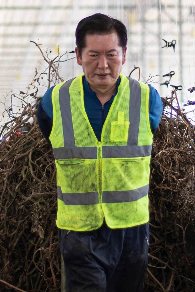 | ▲ 25일 전남 나주에서 토마토 줄기 걷어내기 작업을 하고 있는 정청래 더불어민주당 당대표 후보. |