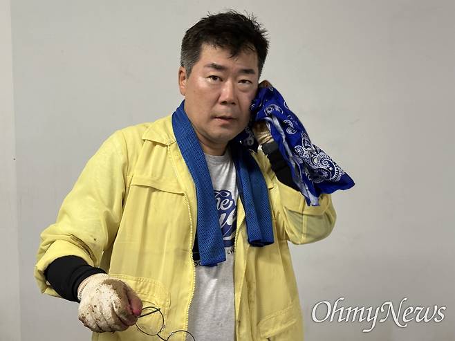| ▲ 더불어민주당 당대표 후보인 박찬대 의원이 극한호우 침수피해를 입은 광주광역시 다드리가구 백화점에서 수해 복구 자원봉사를 하다가 땀을 닦고 있다. |
