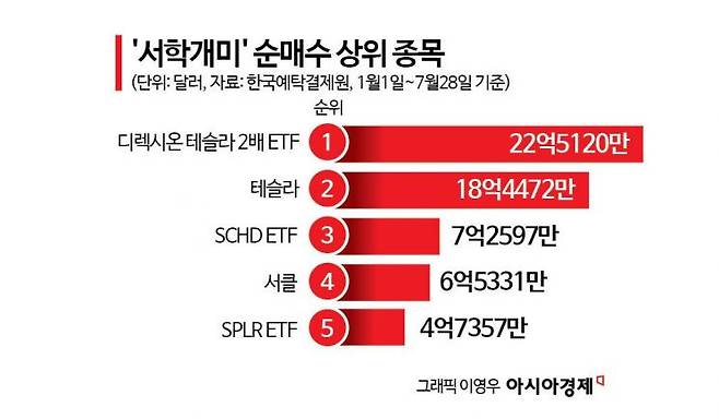 30일 한국예탁결제원 증권정보포털에 따르면 올해 들어 지난 28일까지 국내 투자자들이 가장 많이 순매수한 해외 주식은 '디렉시온 테슬라2배 상장지수펀드(ETF)'다. 총 22억5120만달러(약 3조1342억원)를 사들이면서 압도적 1위를 차지했다. 2위는 테슬라로 18억4472만달러를 순매수했다. 이어 ▲SCHD(미국 대표 배당 성장 ETF) 7억2597만달러 ▲써클(미국 스테이블코인 발행사) 6억5331만달러 ▲SPLR(뱅가드의 S&P500 지수 추종 ETF) 4억7357만달러 등의 순서였다. SCHD를 제외하면 모두 급격한 성장세를 노린 종목들이다. 구글, 팔란티어, 메타 등 빅테크 관련주들도 상위권에 올랐다.