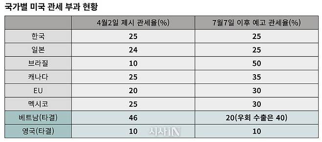 트럼프는 7월7일 이후 다른 동맹국들에 대해서도 4월2일 발표보다 높은 예고 관세율을 잇따라 발표하고 있다. 캐나다는 25%에서 35%로, 유럽연합(EU)은 20%에서 30%로, 멕시코는 25%에서 30%로 올렸다.